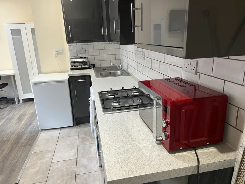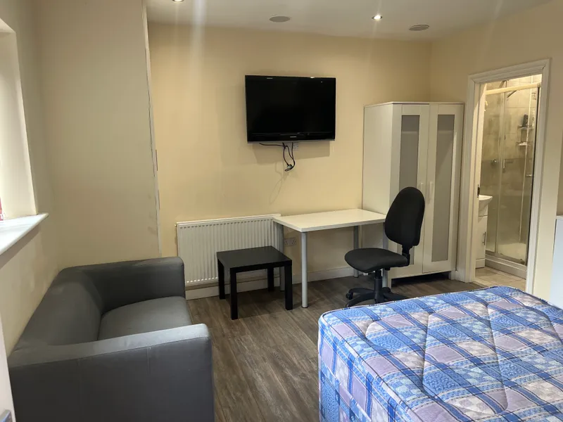 This fully furnished studio offers everything you need for independent student living — featuring a comfortable double bed, study area with desk and chair, private kitchenette, and a modern en-suite bathroom.